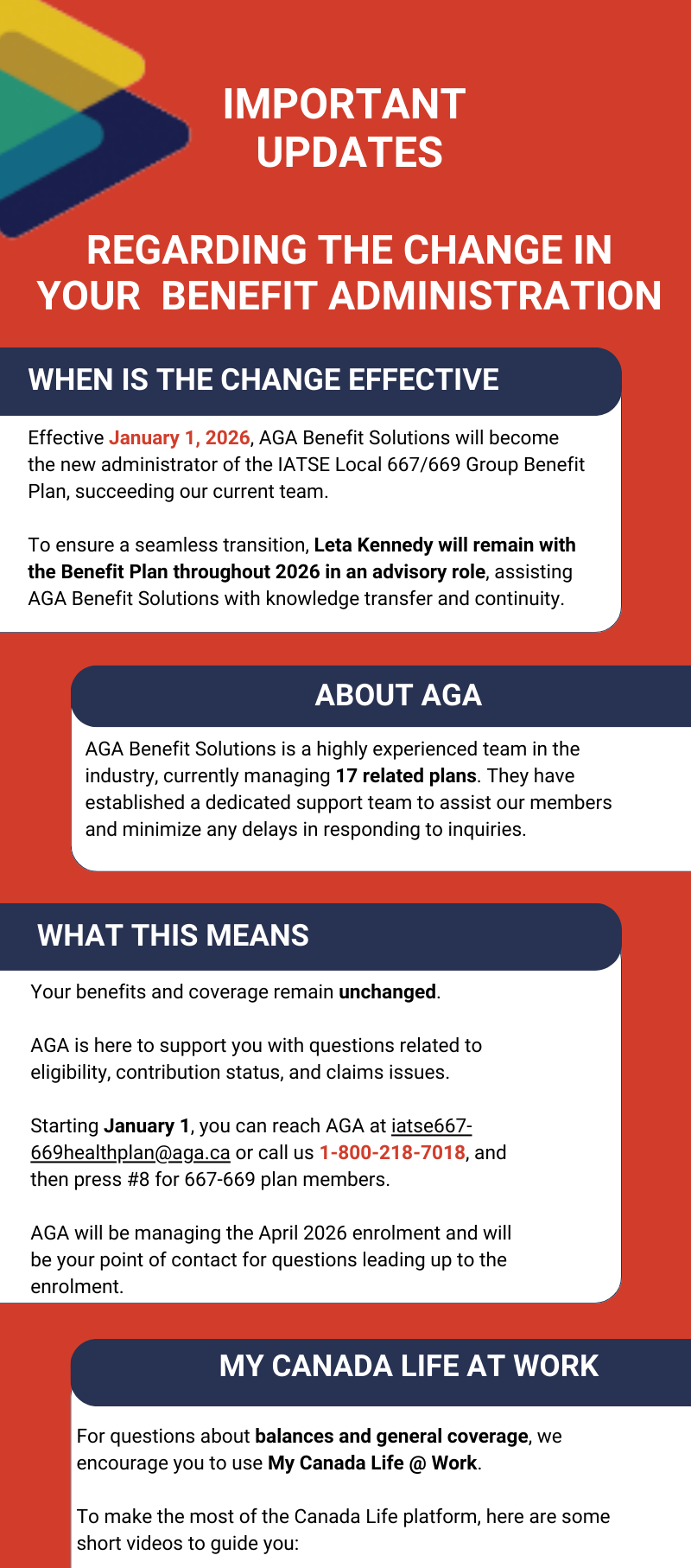 The plan/policy number is specific to the I.A.T.S.E. Local 667/669 Health & Welfare Plan. You will require this number when you file claims and contact Canada Life.